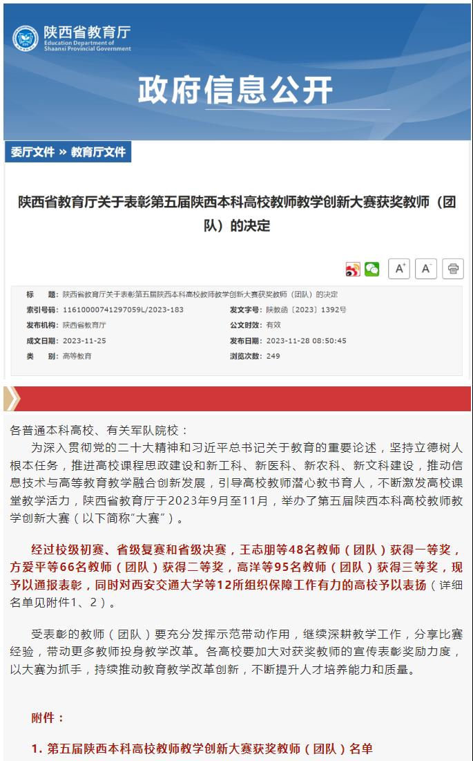日前,由中共陕西省委教育工委、陕西省教育厅主办的第五届陕西本科高校教师教学创新大赛决赛在线举行,在学校领导的高度重视和教务处的密切支持下,太阳官网数学与统计学院教师屈改珠教授团队(成员:苗蓉、关文吉、张永红)经过初赛脱颖而出,最终入围决赛并喜获基础组三等奖。