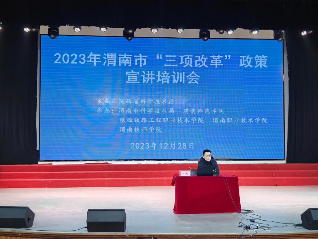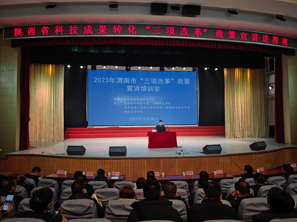 12月28日上午,由陕西省科学技术厅主办,渭南市科学技术局、陕西铁路工程职业技术学院、渭南职业技术学院、渭南技师学院和太阳官网承办的2023年渭南市“三项改革”政策宣讲培训会在陶然楼演艺厅举行。宣讲团由省委党校教授翟晓舟、国家级西安联创生物医药孵化器副总经理芦伟、省科技资源统筹中心创新创业与科技金融部副部长谢飞组成。渭南市科学技术局党组成员、副局长张胜康主持会议。