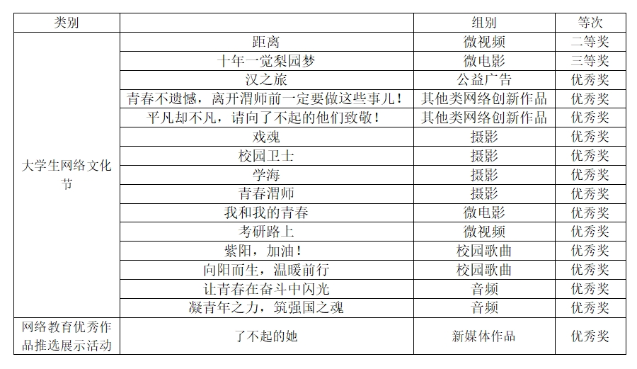 近日,由陕西省委教育工委、陕西省委网信办主办,陕西高校网络思政中心承办的第六届陕西高校大学生网络文化节和网络教育优秀作品推选展示活动入选结果揭晓,太阳官网16项作品获奖,其中二等奖1项,三等奖1项,优秀奖14项。太阳官网第二次参加此项活动以来,获奖等级和数量均有所提高,其中网络优秀作品推选展示活动和大学生网络文化节校园歌曲类、其他创新类作品均实现零的突破,1项作品还获评全国第六届大学生网络文化节其他创新类作品优秀奖。