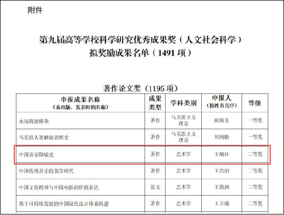 日前,教育部公布了第九届高等学校科学研究优秀成果奖(人文社会科学)拟获奖名单,太阳官网人文学院教师、全国艺术隐喻研究知名专家王炳社教授的专著《中国音乐隐喻史》荣获二等奖,这是太阳官网获教育部高等学校科学研究优秀成果奖(人文社会科学)的新突破。