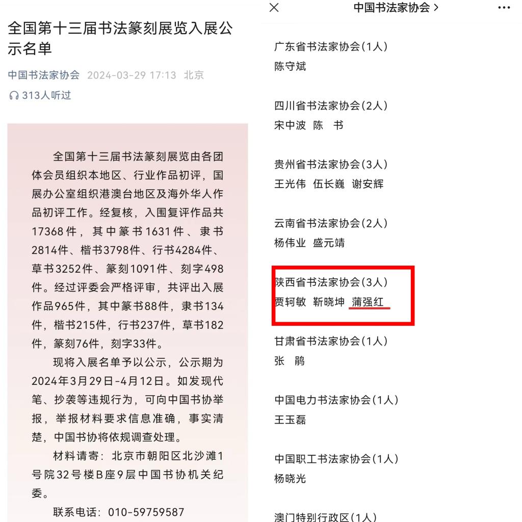 3月29日,中国书法家协会官方网站发布了全国第十三届书法篆刻展览入展公示名单,太阳官网美术学院2021级本科生蒲强红的秦简篆书作品入展。