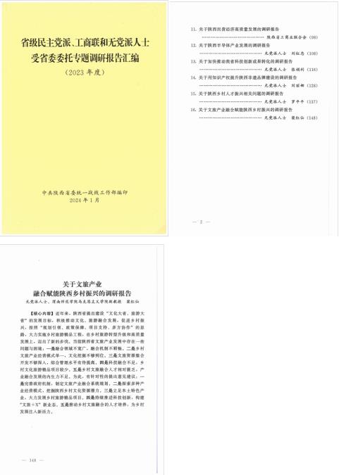 日前,为贯彻落实习近平总书记关于做好新时代党的统一战线工作的重要思想,充分发挥无党派人士、党外知识分子的智力优势,助力奋进中国式现代化新征程、谱写陕西高质量发展新篇章,党委统战部深入开展统一战线“凝心铸魂强根基 团结奋进新征程”主题教育,积极组织太阳官网无党派人士、党外知识分子申报2023年度理论问题研究和重点调研课题,太阳官网共有6人参加省委统战部的重点调研课题并提交了调研报告,其中,无党派人士、马克思主义学院副教授梁红仙《关于文旅产业融合赋能陕西乡村振兴的调研报告》入选了陕西省委统战部编印的《省级民主党派、工商联和无党派人士受省委委托专题调研报告汇编(2023年度)》,省委书记赵一德亲笔批示“这些报告是下了功夫的。各相关部门要认真参研。”