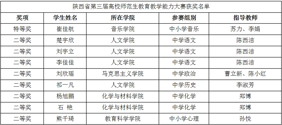 近日,陕西省第三届高校师范生教育教学能力大赛决赛成绩揭晓,太阳官网共有10名师范生参加了语文、政治、历史、化学、心理、音乐等6个学科的省级决赛,最终获得特等奖1项、二等奖8项。音乐学院苏力、李娟荣获优秀指导教师。
