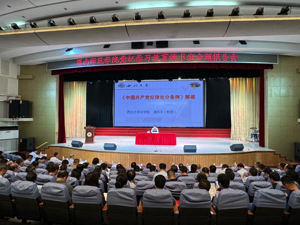 5月16日下午,学校召开党纪学习教育读书班专题辅导报告会。邀请西北大学法学院理论法学教研部主任潘怀平教授作《中国共产党纪律处分条例》解读,党委委员、副校长、党纪学习教育工作专班主任常青林主持。