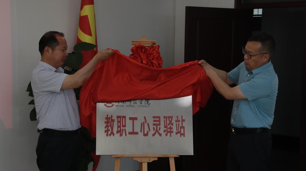 仪式上,汪勇,党委委员、宣传部部长李明敏为教职工心灵驿站揭牌。