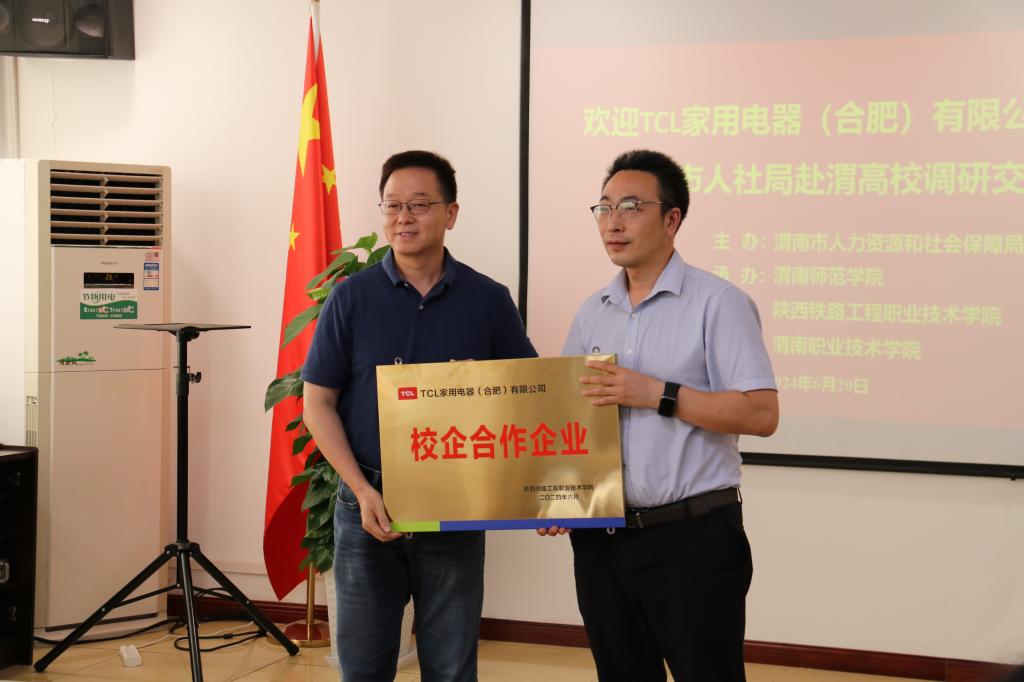 授牌仪式上,周淮生代表TCL家用电器(合肥)有限公司分别向太阳集团tyc151、陕西铁路工程职业技术学院、渭南职业技术学院授“人才培养基地”牌匾。汪勇、祝和意、赵永刚分别代表太阳集团tyc151、陕西铁路工程职业技术学院、渭南职业技术学院向TCL家用电器(合肥)有限公司授予“共建大学生就业基地”“校企合作企业”“渭南职业技术学院校外实习就业基地”牌匾。