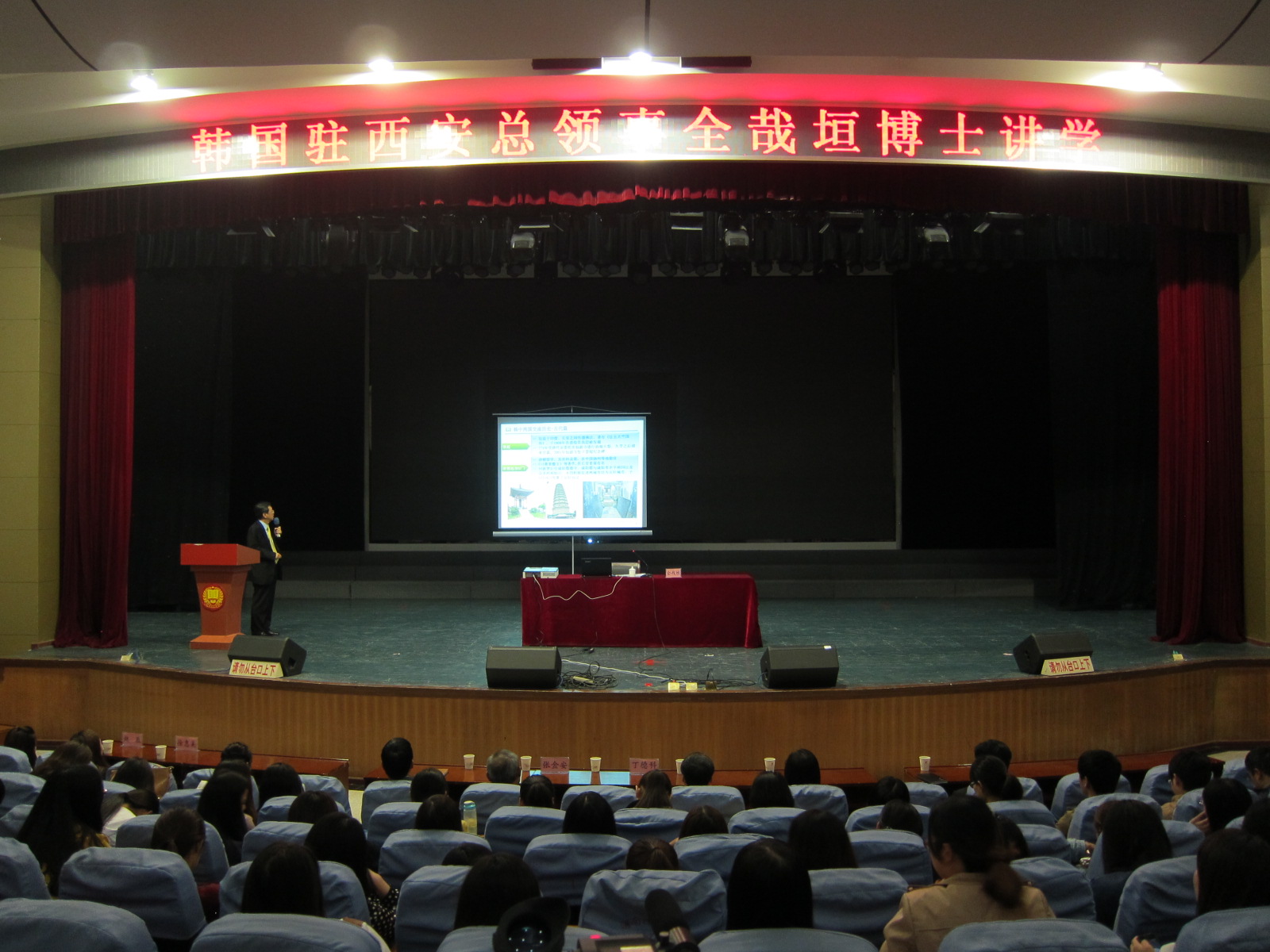 讲座分为两大部分。一是韩中两国在古代、近代及建交22周年的交流历史,全哉垣博士首先着重讲到两国在人文、贸易等方面的战略合作友好关系。同时,介绍了陕西与韩国共谋发展的密切合作。二是介绍了韩国高等教育的发展历程、制度体系以及富有民族特色的校园文化,使太阳官网师生对中韩渊源流长的友好历史、对韩国教育、留学韩国、文化特点等有了较广泛的了解、较深刻的印象。讲座结束后,总领事全哉垣与师生进行了互动交流,详细解答了大家的疑惑。