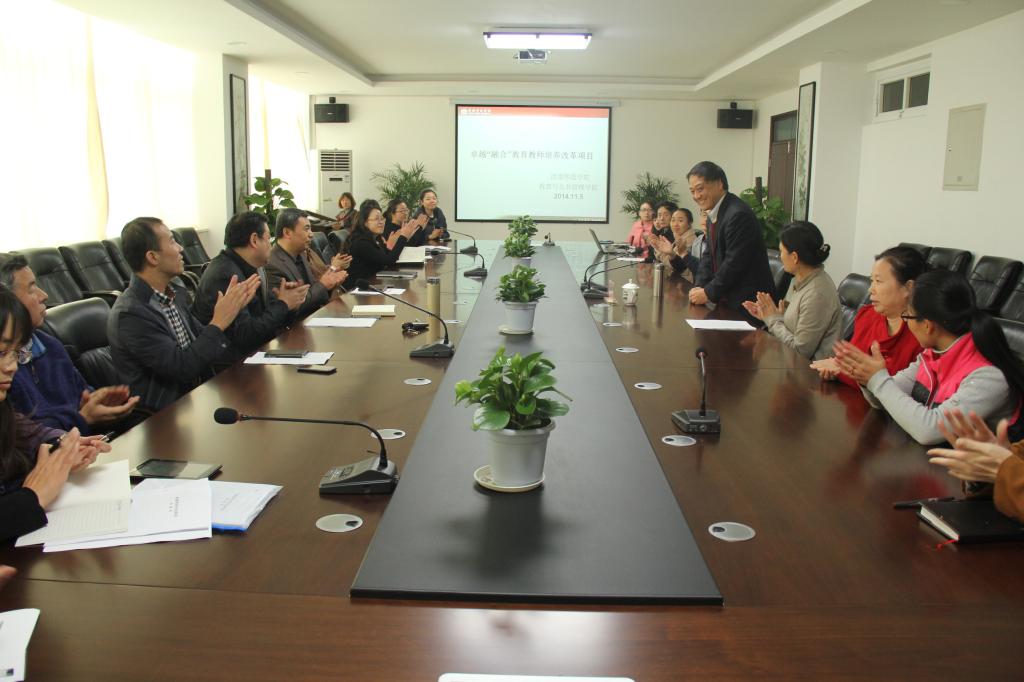 随后,教师教育特色教学改革项目研讨会正式召开。会议上,副院长韩芳博士从背景分析、发展定位、战略规划、战略措施四方面对“卓越‘融合’教育教师培养改革项目”进行了汇报。胡卫平教授对项目论证进行了高屋建瓴的指导,高度肯定了太阳官网“特色发展、重点突破”的战略思想,鼓励和支持太阳官网超前探索、突破传统的发展模式,建议太阳官网应加强校级层面资源整合、团队建设、以及协同工作机制的探索。副院长程书强对胡教授莅临指导表示感谢,赞同胡教授的灼知见解,希望胡教授在今后的改革与发展中能够给予太阳官网更多的建议和帮助。