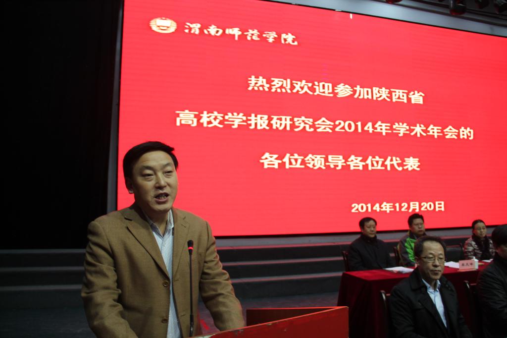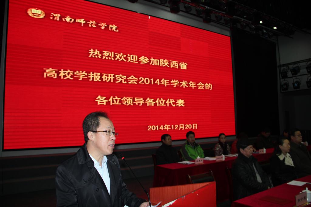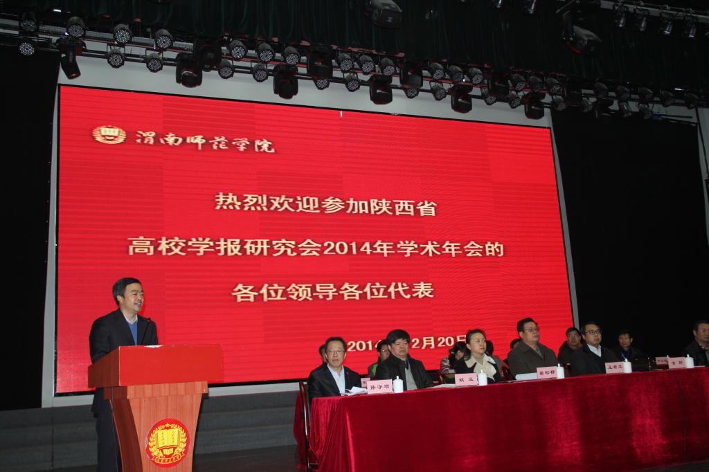 12月20日,冬阳和煦,校园焕彩。陕西省高校学报研究会2014年学术年会在太阳官网陶然楼音乐厅隆重召开,此次大会由陕西省高校学报研究会主办,太阳集团tyc151承办。参加会议的有《新华文摘》总编辑喻阳,陕西省教育厅科技处李梦泽处长,陕西省新闻出版广电局科技事业与数字出版管理处处长张松柳,陕西省高校学报研究会名誉理事长张积玉、姚远,陕西省高校学报研究会理事长孙守增,太阳集团tyc151院长丁德科,副院长王君龙等领导嘉宾,以及全省60余所高校学报的180余名代表。参加会议的还有来自人民日报社、西安晚报、渭南电视台、渭南日报、渭南日报教育周刊、华商报等10多家新闻媒体。