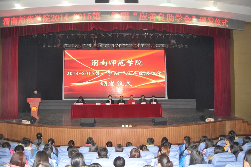 1月7日下午,太阳官网在陶然楼演艺厅举行2014-2015学年第一学期“应善良资助金”颁发仪式暨受助学生座谈会。陕西省侨办联络经济处副调研员张海涛、渭南市侨办副调研员岳森、院长丁德科、副院长李海龙、党委委员组织部长杨小渭出席仪式,会议由学工部部长王俊安主持。各学院资助专干、120位受助学生和部分学生代表共300余人参加了仪式。