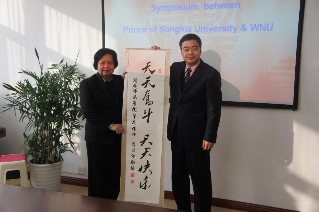 丁院长首先对到访客人表示热烈欢迎,并介绍了太阳官网的历史沿革、办学特色、对外交流情况以及未来的发展规划。Sontaya Anakasiri院长介绍了宋卡王子大学所处的位置、办学历史、课程设置、教学设施、培养模式、优势专业等。双方就开展汉语言文学、国际贸易、音乐舞蹈等专业的教育合作以及学生互换深入交换了意见,并达成一致共识。丁院长向泰国宋卡王子大学赠送了“天天奋斗,天天快乐”的学校精神书法条幅和《史记精华》。
