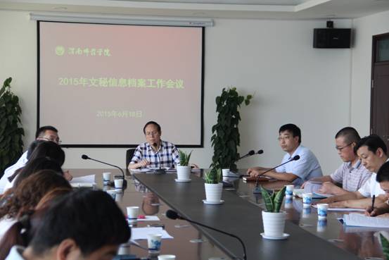 6月18日下午,厚德楼四楼大会议室召开2015年文秘信息档案工作会议,党委委员、组织部长杨小渭、党政办公室主任韩小卫、党政办公室副主任屈琦、各单位文秘信息档案工作人员出席参加。会议由党政办秘书科科长郭石磊主持。