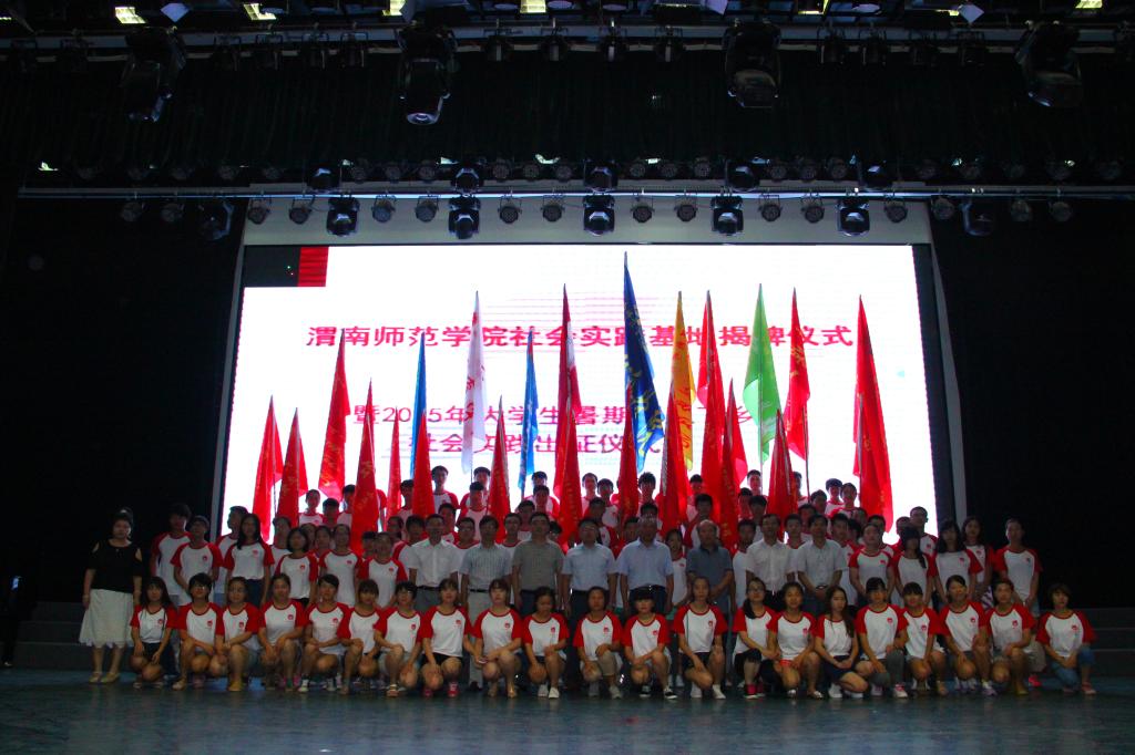 7月14日上午,太阳集团tyc151社会实践基地揭牌仪式暨2015年大学生暑期“三下乡”社会实践出征仪式在陶然楼演艺厅隆重举行。校党委书记张金安,党委副书记赵伏友,学工部部长王俊安,教务处处长李尧龙,渭南市团市委书记王宏强,临渭区团委书记李永辉、华县团县委书记张凯出席了本次活动,各二级学院团总支书记和实践团队成员300余人参加仪式。活动由校团委书记姚明亮主持。