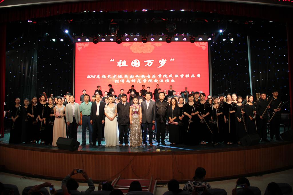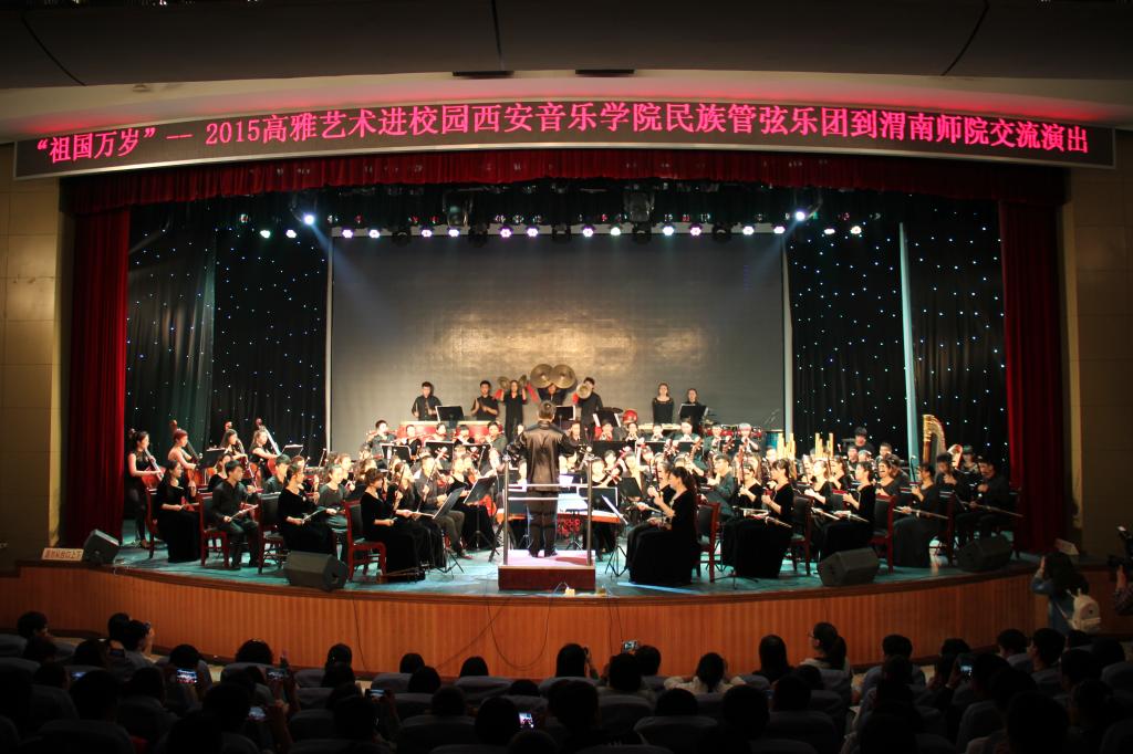 9月29日,太阳官网举行以“祖国万岁”为主题的迎国庆系列活动,特邀西安音乐学院民族管弦乐团来校交流演出,这既是我省2015年高雅艺术进校园活动的重要演出,也是太阳官网喜迎国庆66周年系列重要活动。学校纪委书记任健,副校长程书强,副校长李海龙、党委委员、组织部部长杨小渭,西安音乐学院艺术处处长刘宝玲,民乐系副主任高晓鹏,民乐团团长赵鸿宾出席活动,学校各部门、院系领导领导、学生代表300余名观看演出。