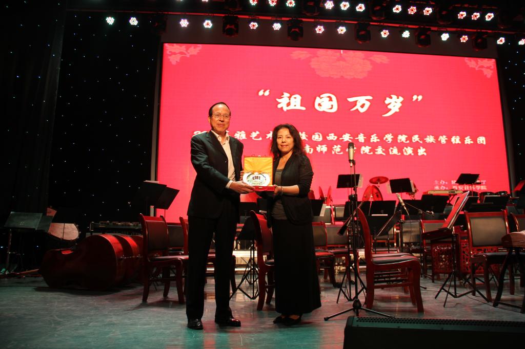 演出交流活动前,学校副院长程书强代表学校进行了热情洋溢的致辞。他指出国家部委开展“走进大师、感受经典、陶冶情操、提高修养”为主题的高雅艺术进校园活动,是普及优秀民族文化艺术,让学生了解世界艺术经典、热爱中华文化的有效途径;对引领大学生弘扬中华文化、吸纳人类先进文明成果、提高审美修养、提升精神境界、丰富优秀校园文化氛围,发挥着重要的积极作用。学校党委委员、组织部长杨小渭与西安音乐学院艺术处处长刘宝玲分别代表两个学校互赠了礼物。