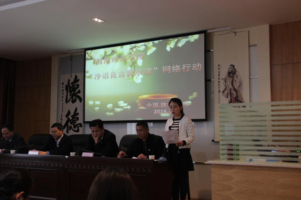 随后,丁德科院长与孙润来副会长共同为陕西孔子学堂推进委员会揭牌。新揭牌的委员会还举办了由中国孔子基金会、共青团中央网络影视中心、全国学校共青团新媒体运营中心联合倡议的青年之声“净语良言我承诺”活动,渭南师院刘闫蕾同学发表了倡议演讲,并带领全体与会人员一起宣誓:“写好字,承中华之脉;读好书,养堂正之气;做好人,扬上善之德;传好文,净网络之境;说好话,树君子之风,行好事,谱青春之歌。”大力倡导青少年主动使用净语良言,树文明新风,建文明校园。