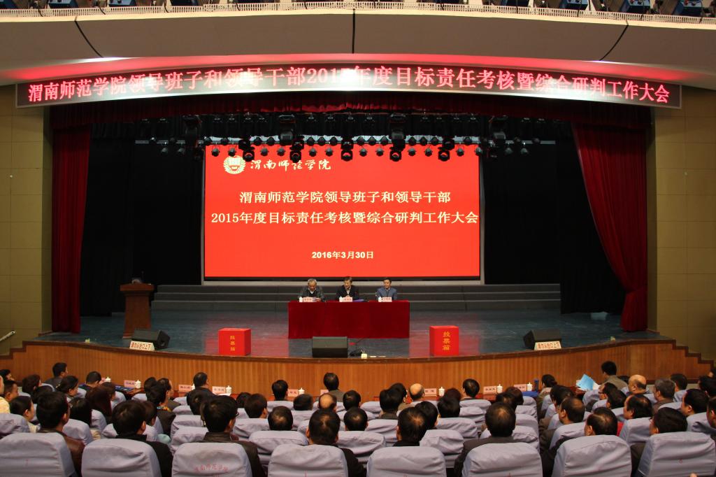 按照省委组织部、省委高教工委的安排,3月30日,学校在陶然楼演艺厅召开校级领导班子和领导干部2015年度目标责任考核暨综合研判工作大会。陕西省属高校领导班子和领导干部目标责任考核暨综合研判第四工作组组长、省委高教工委委员、统战部部长李智军等一行6人来太阳官网,对学校领导班子和领导干部进行年度目标责任考核和综合研判。大会由校党委书记张金安主持。