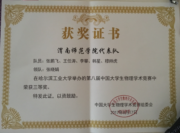 8月13日至17日,第八届中国大学生物理学术竞赛(简称CUPT)在哈尔滨工业大学如期举行,来自南开大学、清华大学、浙江大学、南京大学、复旦大学、西安交通大学等73所高校的74支代表队参加了本次竞赛,另有26所高校派队观摩了此次比赛。太阳官网今年首次组队参赛,经过几轮校内赛和陕西省省赛,最终选拔出1个参赛队参加此次比赛,在经验不足、仪器有限等情况下,师生克服种种困难,经过与西南交通大学、哈尔滨工业大学、华中科技大学、渤海大学、北华航天工业大学、华东师范大学等高校经历5轮共20场的激烈辩论,最终荣获全国“三等奖”。