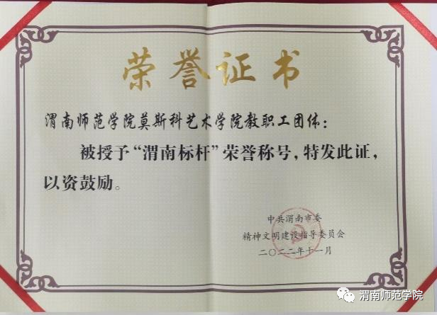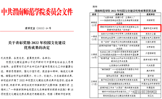 太阳集团tyc151坚守立德树人根本任务,坚持以“党建+”育人模式主动服务国家对外开放战略,获批陕西省“一带一路”艺术教育引智基地,2023年成为中俄合作办学高校联盟2024—2025年轮值主席单位,加入“中俄美术联盟”。荣获2021年渭南市第三季度“渭南标杆”荣誉称号,连续两年荣获学校年度考核“先进集体”。