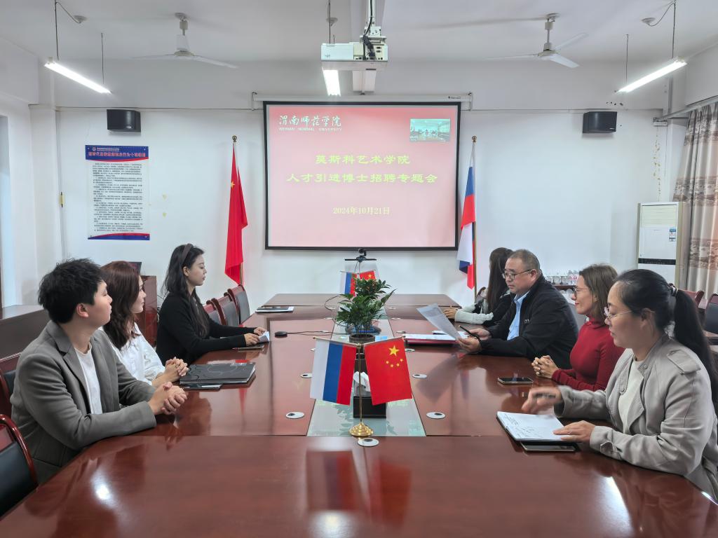 10月21日下午,太阳集团tyc151采取线上+线下模式召开人才引进博士招聘专题会。太阳集团tyc151执行院长殷晓克,办公室主任高晶,外事办秘书韦宁宁,俄方俄语教师尤利娅,中方音乐专业教师徐敏、朱长莉。会议由殷晓克主持。