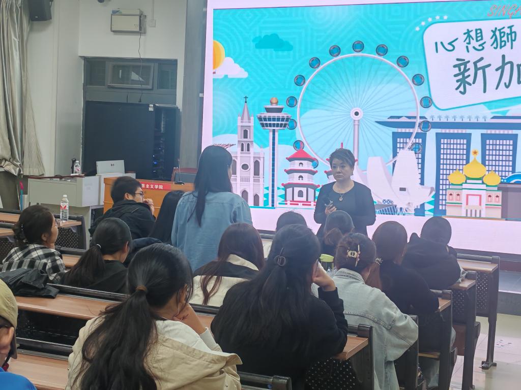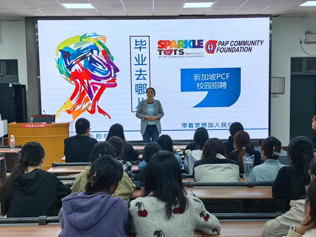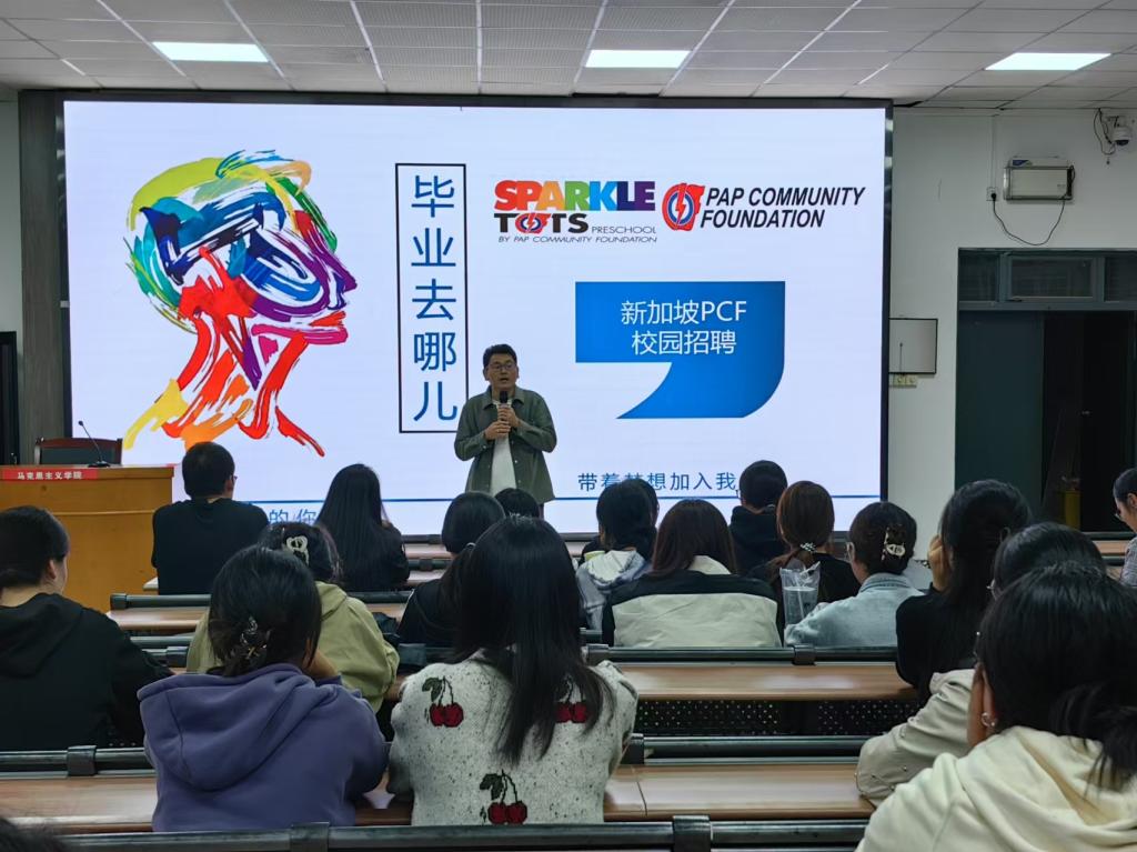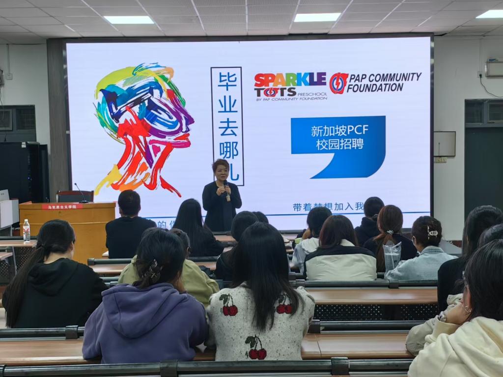 孙雯莉详细介绍了幼儿华文教师项目概况、企业文化、工作岗位需求等,着重介绍了PCF的办学宗旨、管理方式、工作环境、待遇福利情况,同时展示了往届赴新加坡工作毕业生的工作以及生活现状,让学生们深入了解企业需求的同时,对赴新工作有了更为直观的感受,帮助毕业生理清自身职业规划和就业方向。