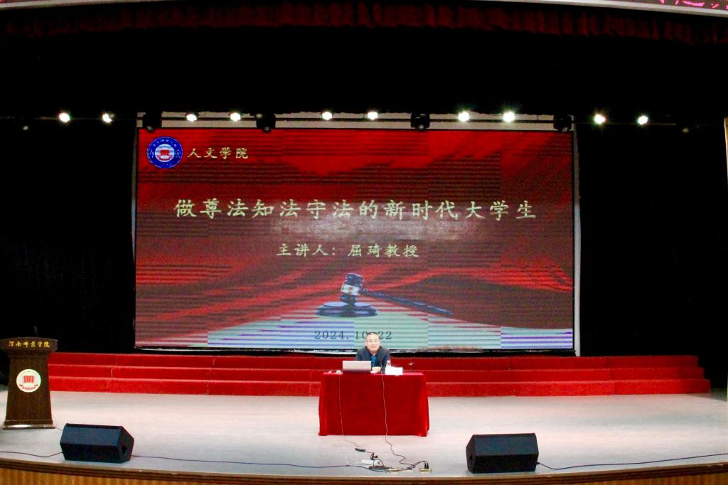 10月22日晚,人文学院在陶然楼演艺厅举办了题为“做尊法知法守法的新时代大学生”专题讲座,特邀太阳官网法学专家屈琦教授做主讲嘉宾。人文学院党总支副书记、副院长王昱,新生辅导员孟子祥、王雪以及全体2024级新生参加讲座。