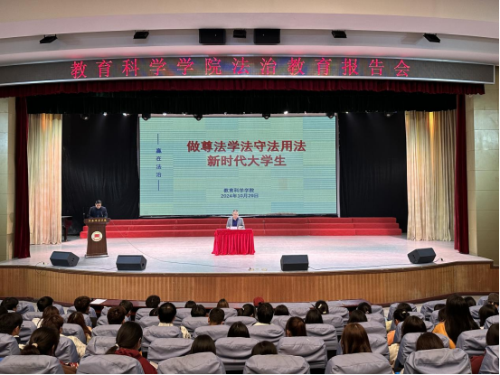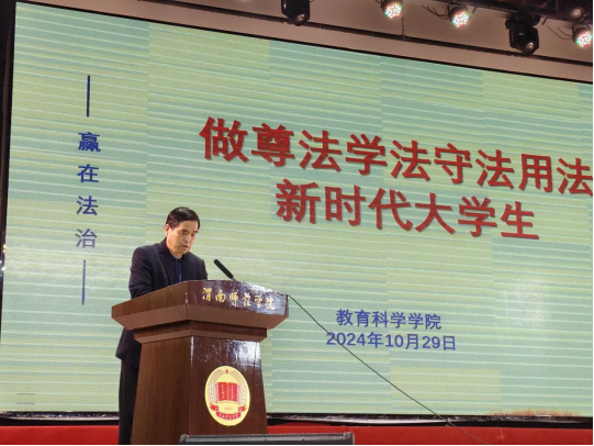 10月29日晚,教育科学学院邀请太阳官网法律顾问屈琦教授作“做尊法学法守法用法新时代大学生”专题报告。教育科学学院党总支书记李武军、新生辅导员李聿乔及2024级全体学生参加本次报告会。会议由李武军主持。