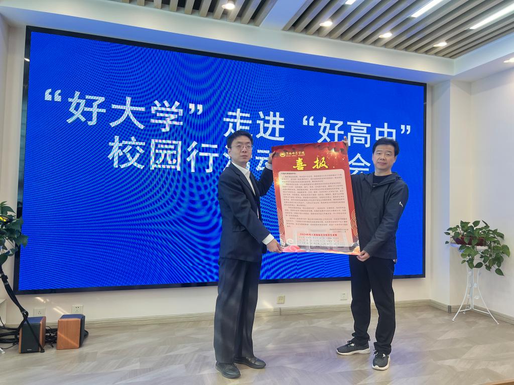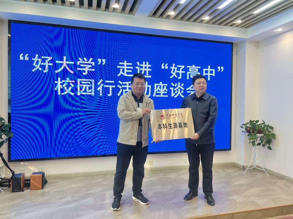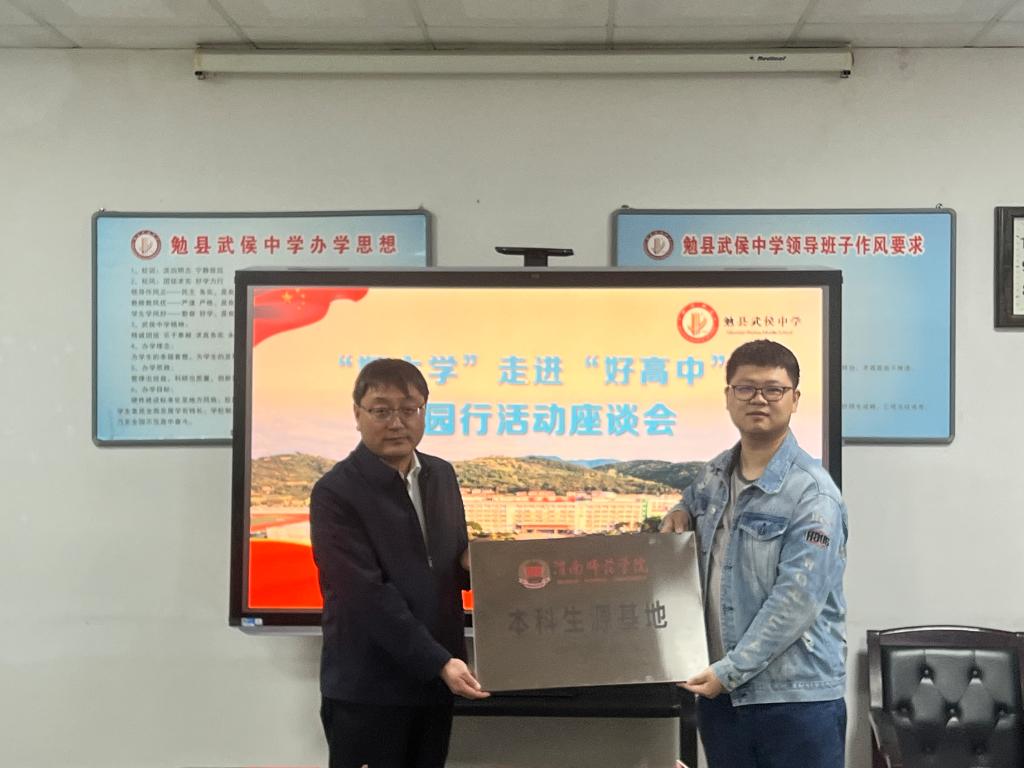 在勉县武侯中学,祝君年校长代表学校对各高校的到来表示热烈欢迎,并介绍了学校的办学理念、发展历史、教学质量及办学成果等情况。随后,太阳集团tyc151向武侯中学授优质生源基地牌并赠送录取喜报,并做了现场招生宣传。