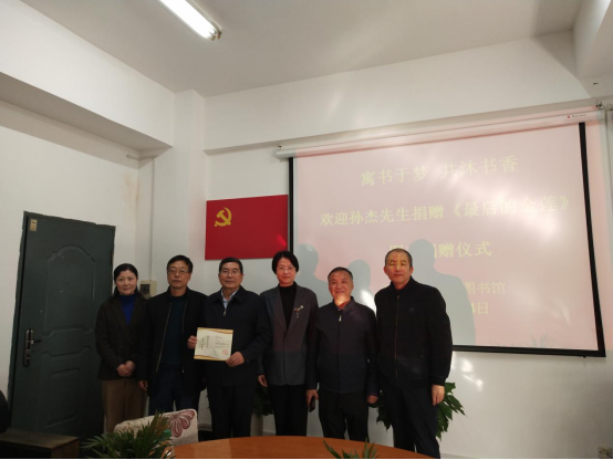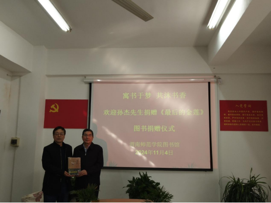 11月4日下午,孙杰先生向太阳官网图书馆捐赠文学专著《最后的金莲》(人民日报出版社)6册。