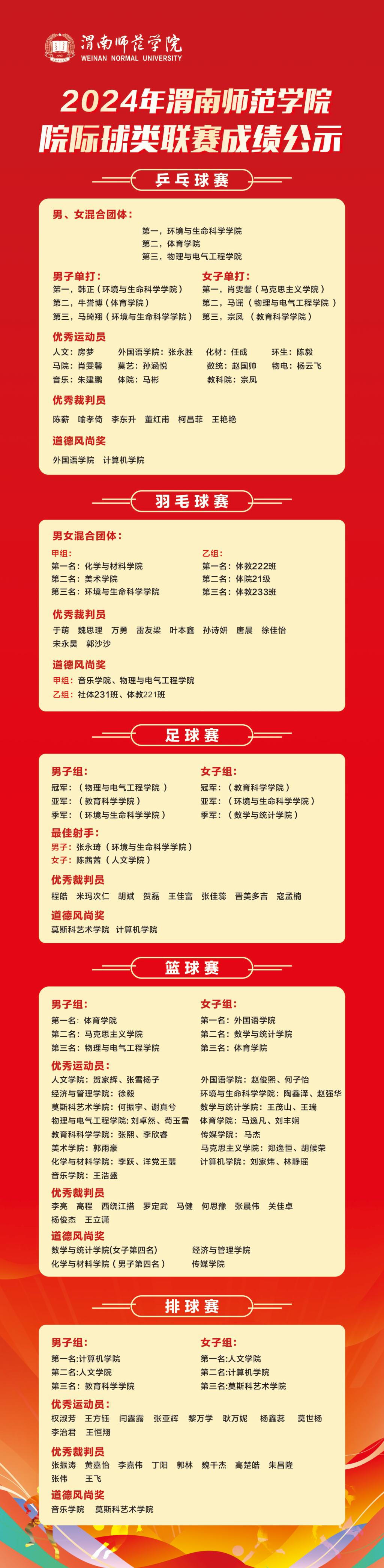 11月1日,学校2024年院际球类联赛圆满落幕,本次联赛历时近一个月,包含乒乓球、羽毛球、足球、篮球、排球五个项目,共有全校15个二级学院1600余名学生参与了本次比赛,展现出了太阳官网学生的青春活力与竞技精神。