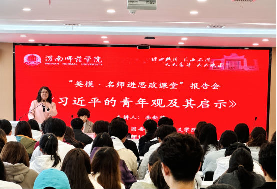 11月14日下午,在教务处、团委大力支持下,马克思主义学院邀请全国优秀教育工作者,教育部高等学校思想政治理论课教学指导委员会委员,高校思想政治理论课教师影响力人物、陕西省教学名师、陕西铁路工程职业技术学院马克思主义学院院长李新萍教授作题为《习近平的青年观及其启示》报告会。各学院学生代表90余人参加了报告会。报告会由马克思主义学院院长张萍主持。