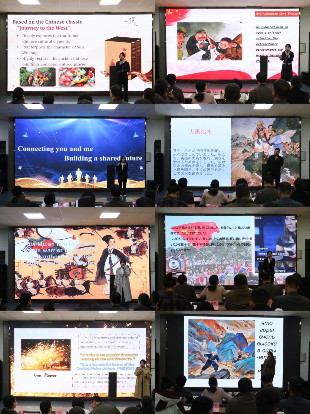 经过前期初赛选拔,共有15名选手脱颖而出进入最终决赛。比赛中,学生同台竞技、各展其能,围绕中国寓言故事、神话故事、传统文化、非遗技艺、抗战精神、数字经济等主题,使用英语、俄语、日语等语言,或激昂慷慨地阐述深刻的观点,如中国数字经济的崛起,振奋人心;或在温婉动人的背景音乐烘托下,向观众细数“中国风”文化的独特魅力;或娓娓道来温暖的故事,似轻柔的春风,抚慰心灵。他们以语言为画笔,以思想为颜料,在文化交融的画卷上挥洒出绚丽多彩的篇章。
