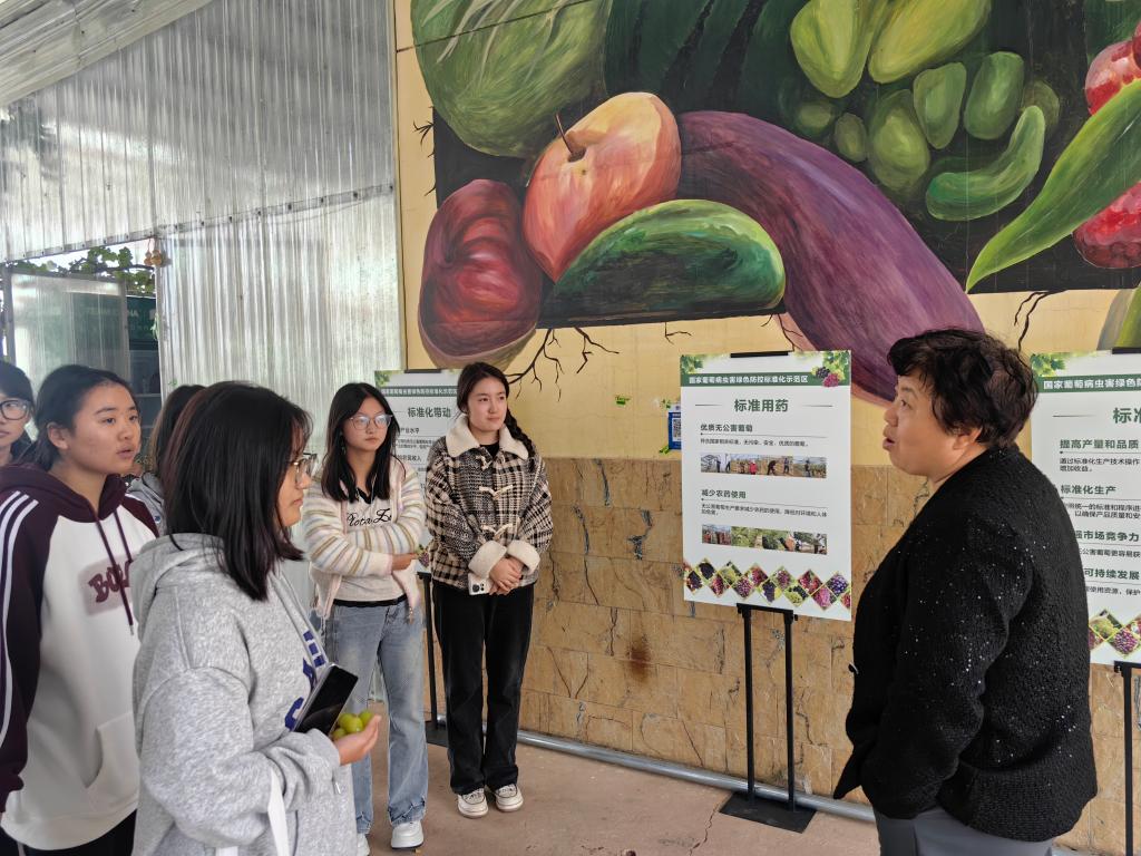 在绿盛农业基地负责人袁博的带领下,师生们前往企业葡萄产业园区。漫步于葡萄园中,大家品尝了那些在“标准管理、标准用药、标准化带动”模式下培育出的甜美葡萄,深切感受到了现代农业的魅力。同时,眼前的田间美景也让师生们陶醉其中,流连忘返。