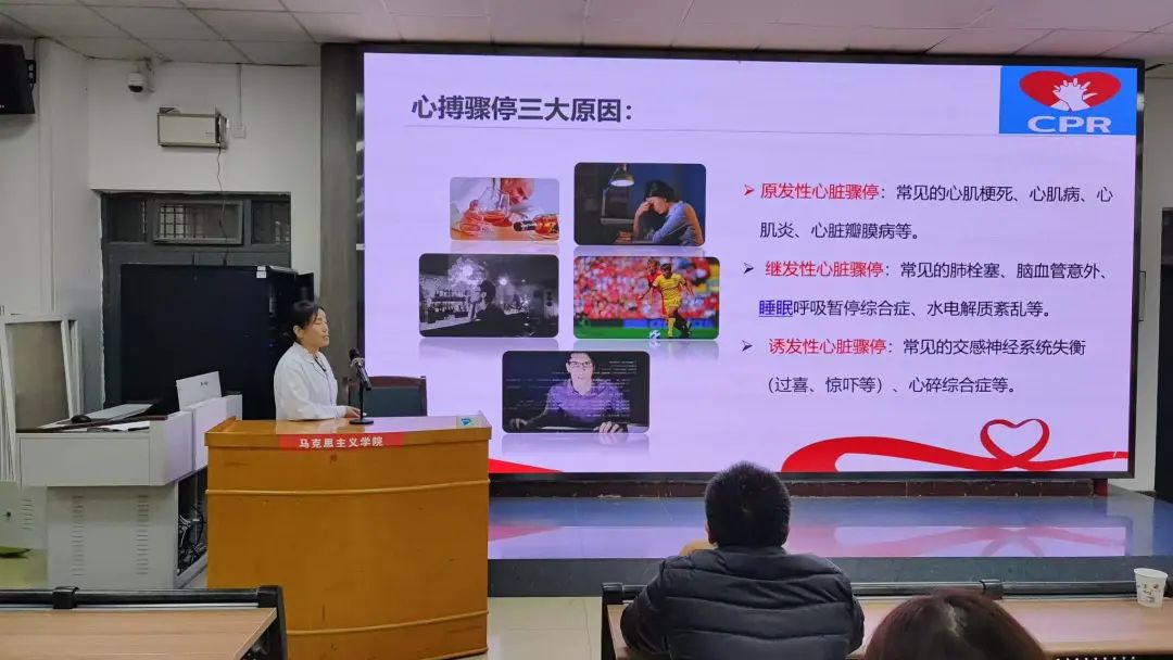 11月13日下午,人文学院联合太阳官网附属医院在博识楼1101教室开展急救知识专题培训,特邀附属医院副院长王新英主讲,护理部护师李艳妮、李贵群做操作演示。人文学院副院长雷炳锋、辅导员及学生代表150余人参加了此次培训,学工办副主任孟子祥主持。