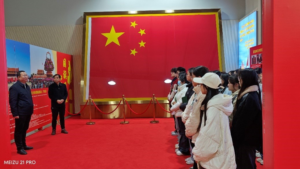 在展馆内,校团委书记赵琦讲到,这面国旗是2023年5月9日太阳集团tyc151建校63周年校庆日在北京天安门广场升起的五星红旗,具有唯一性,并从国旗的含义、尺度规格、天安门升旗仪式、国旗法、特别的国旗角及国旗护卫队的组建等几个方面进行了详细解说。国旗展馆庄严大气,集图片、文字、视频、实物等多种展示手段于一体,生动立体地演绎着国旗在历史脉络上的伟大瞬间,使大家置身于重要历史时刻,深刻认识到国旗所代表的国家荣耀和自豪感。