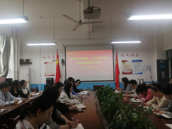 4月15日下午,数学与统计学院第一、第二学生党支部在学院会议室召开党纪学习教育学习会议。各支部师生党员参加,第一学生党支部书记张菊梅主持会议。