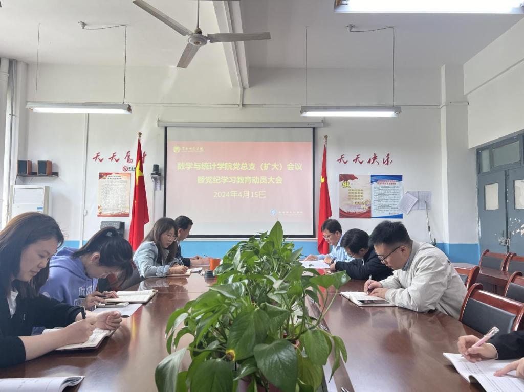 4月15日上午,数学与统计学院党总支在学院会议室召开党总支扩大会议暨党纪学习教育动员大会,安排部署学院党纪学习教育工作。学院党总支委员、党支部书记、全体行政人员参加,党总支书记武江波主持会议。