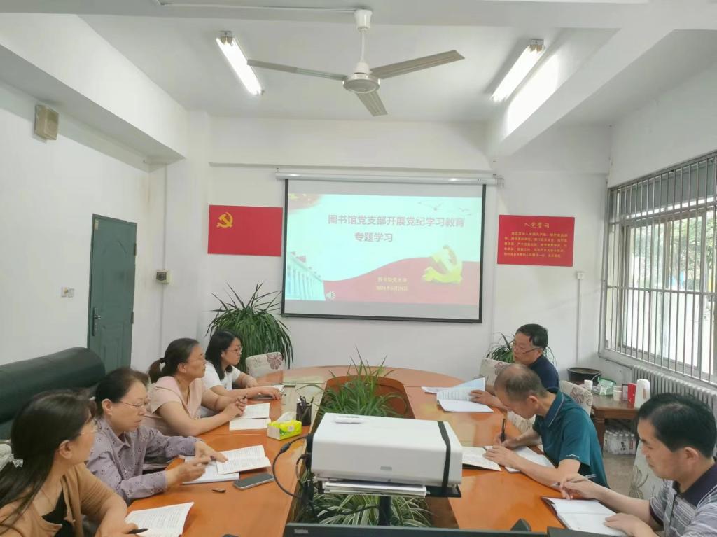 5月29日下午,图书馆党支部在党总支会议室召开党纪学习教育专题学习会议,全体党员参加。